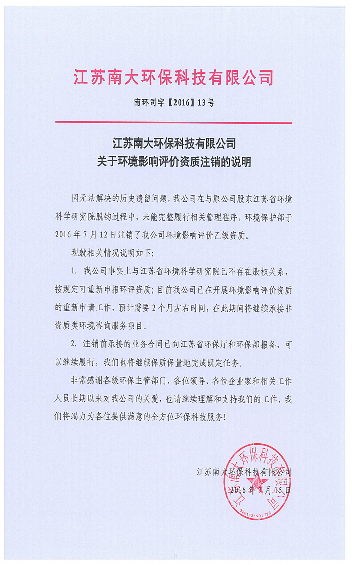 江苏澳门皇冠博彩官网关于环境影响评价资质注销的说明