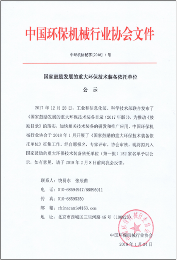 2017年12月28日,工业和信息化部、科学技术部联合发布了《国家鼓励发展的重大环保技术装备目录(2017年版)》,我司“连续吸附再生水处理装备“入选该目录。为推动《鼓励目录》落实,加快相关技术装备的研发和推广应用,中国环保机械行业协会于2018年1月开展了《国家鼓励发展的重大环保技术装备依托单位》征集工作。我司积极组织策划,开展相关申报工作。最终,我司凭借技术优势,入选国家鼓励发展的重大环保技术装备依托单位(http://www.bjcamie.org.cn)。