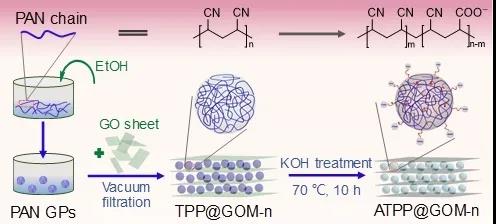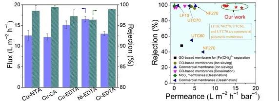 针对上述问题,张炜铭、潘丙才教授课题组借鉴纳米仿生思路,首次提出通过软物质插层剂构建类似水通道蛋白通道的新策略。研究以实现污废水中重金属络合物的高效分离与水质净化为最终目标,首先制备出聚丙烯腈凝胶软粒子(PAN GPs,1-8nm)作为氧化石墨烯(GO)膜的纳米级插层剂,通过控制GO膜层间PAN GPs形变、溶胀以及PAN GPs-π作用实现了亚纳米尺度的层间距离精确调控,与此同时GO膜规整的层状结构得以充分保留。此外,通过碱性处理可在PAN GPs表面产生电荷和双疏水/亲水性,有机融合了水通道截留性与水的快速渗透,成功构建出类似水通道/蛋白通道结构。研究结果表明,该GO复合膜可截留96%以上的重金属络合离子(Cu-NTA、Cu-CA、Cu-EDTA、Ni-EDTA、Cr-EDTA),水通量是文献报道同类膜的4-13倍。这一研究深入探究了纳米级软颗粒插层剂与氧化石墨烯薄片之间的相互作用及其高水通和高截留的限域分离构效机制,提出的软颗粒插层策略有望成为设计和研制高性能水处理二维复合膜的新方向。