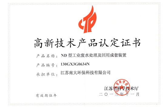 2013年9月,为使公司的研发成果及时得到相关方肯定,由总工办牵头组织,在应用研发部、设计部及财务部的协助下,我公司以“ND型工业废水处理及回用成套装置”为产品名称,参与了2013年江苏省第四批高新技术产品的申报。经过两个月的等待,申报材料经主管部门初审、网上复审、专家评审及科技厅复核,最终得到各方认可,申报的产品成功获批“江苏省高新技术产品”,证书编号:130GX3G0634N。批文于11月底下达至主管部门,现已拿到认定证书。