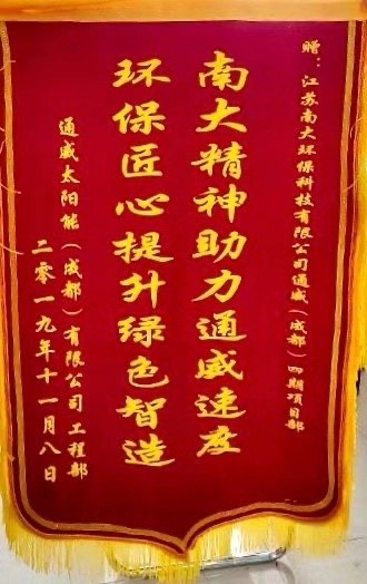 南大精神助力通威速度 环保匠心提升绿色“智”造——澳门皇冠博彩受到通威太阳能(成都)有限公司表彰近日,澳门皇冠博彩收到通威太阳能(成都)有限公司的锦旗和表彰信,澳门皇冠博彩在年产3.8GW高效晶体硅太阳能电池互联工厂建设项目中,面对困难勇于担当,全力攻克,为保障业主生产调试废水出水任务做出突出贡献。业主单位在表彰信中提到,澳门皇冠博彩一线工程人员在工期紧张和环境艰苦的情况下,不畏挑战迎难而上,把预计45天的工期压缩到20天,并且保质保量地完成各项任务及要求,为整体项目的推进贡献了力量。