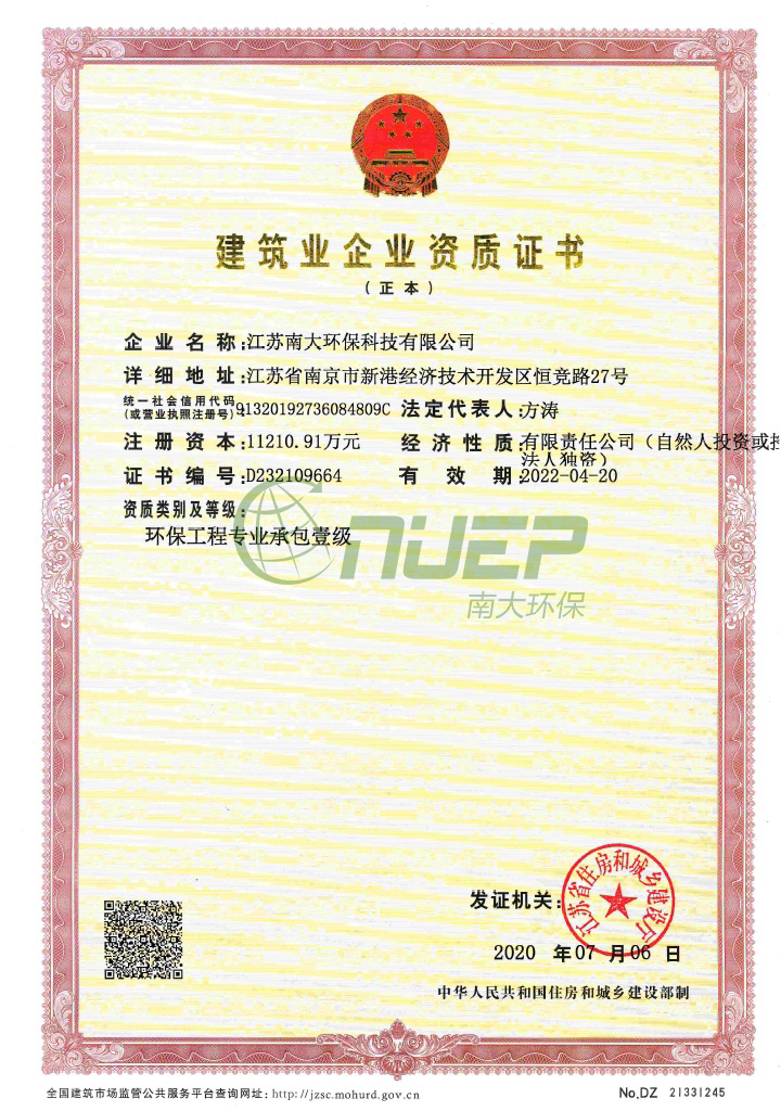 近日,澳门皇冠博彩官网成功通过江苏省住建厅环保工程一级施工资质申报审核,取得了环保工程专业承包壹级资质证书。