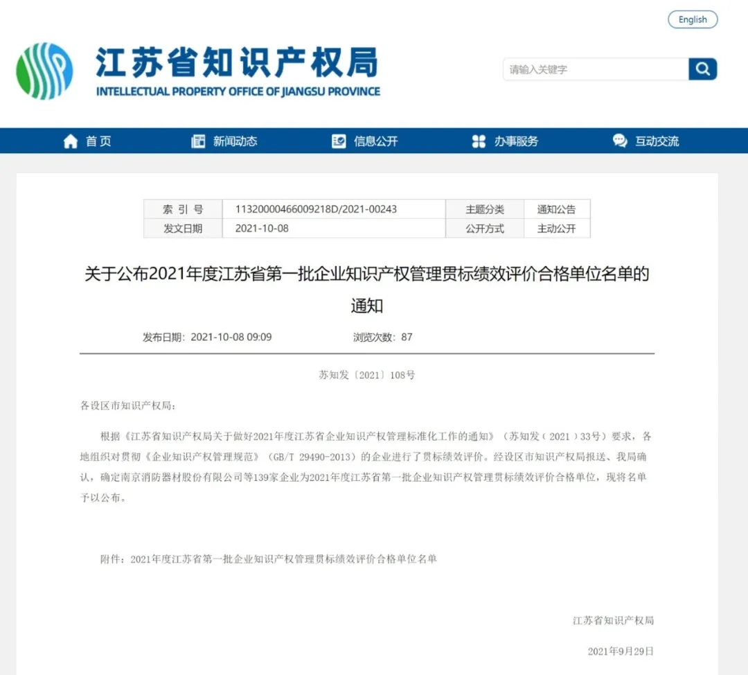 9月29日,江苏省知识产权局发布了《关于公布 2021 年度江苏省第一批企业知识产权管理贯标绩效评价合格单位名单的通知》,澳门博彩官网“榜上有名”,表明公司知识产权管理体系已经符合国家标准《企业知识产权管理规范》(GB/T 2949...